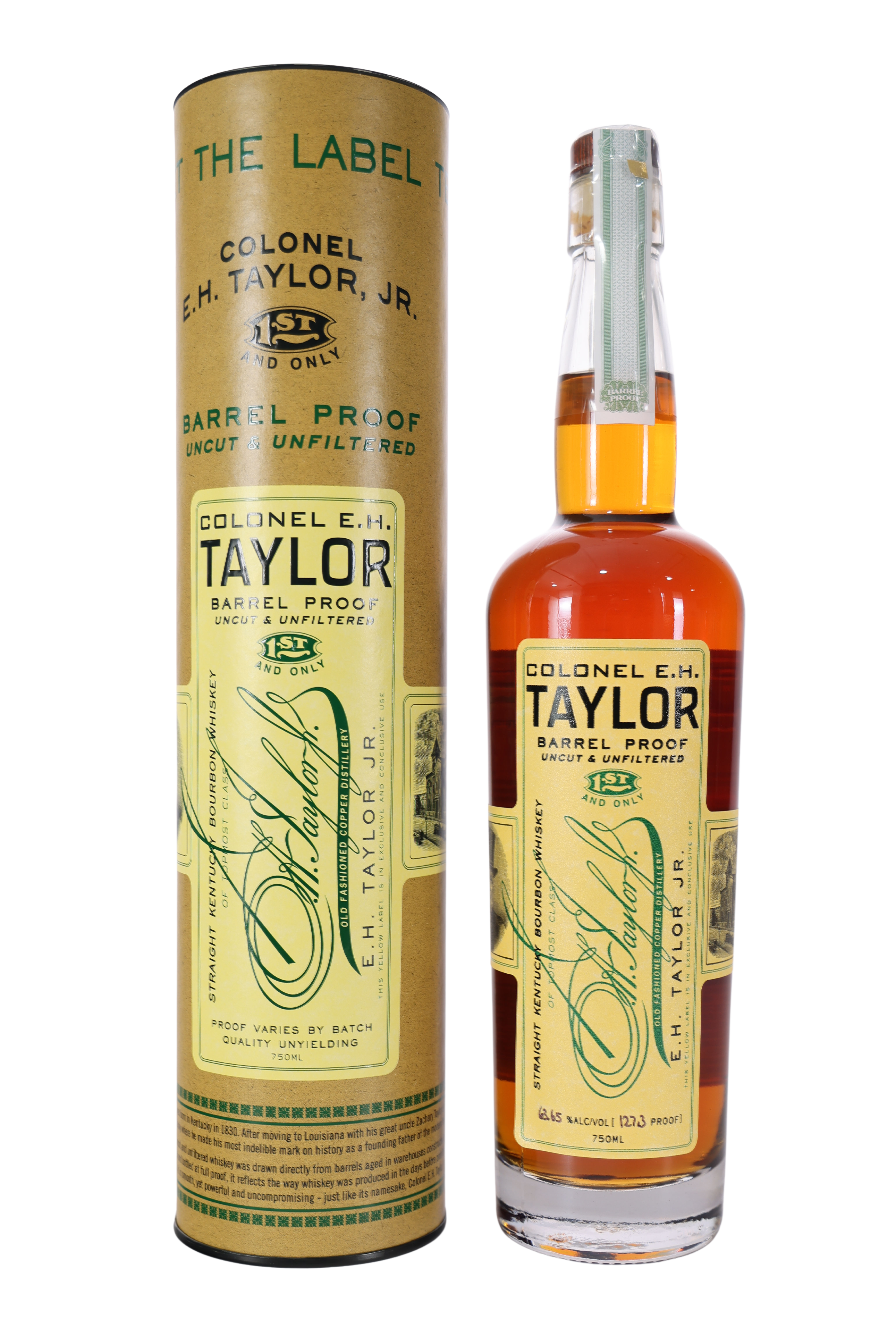 Colonel E.H. Taylor 'Barrel Proof' Bourbon (Batch 10, 2021) celebrates the legacy of one of the most influential figures in American whiskey history. E.H. Taylor, Jr., often called the “Father of the Modern Bourbon Industry,” pioneered advancements in bourbon production and championed the Bottled-in-Bond Act of 1897. This highly sought-after release, presented in its distinctive vintage tube and tall bottle, honors Taylor’s commitment to uncompromising quality. Batch 10, released in 2021 at 127.3 proof, is drawn straight from the barrel, uncut and unfiltered, offering collectors a rare connection to whiskey’s storied past. Each bottle in this limited series is individually numbered, reflecting its unique place in a lineage that traces back to the historic Buffalo Trace Distillery. For enthusiasts and historians alike, this release is a prized addition to any collection, embodying the enduring spirit of Colonel Taylor’s vision.