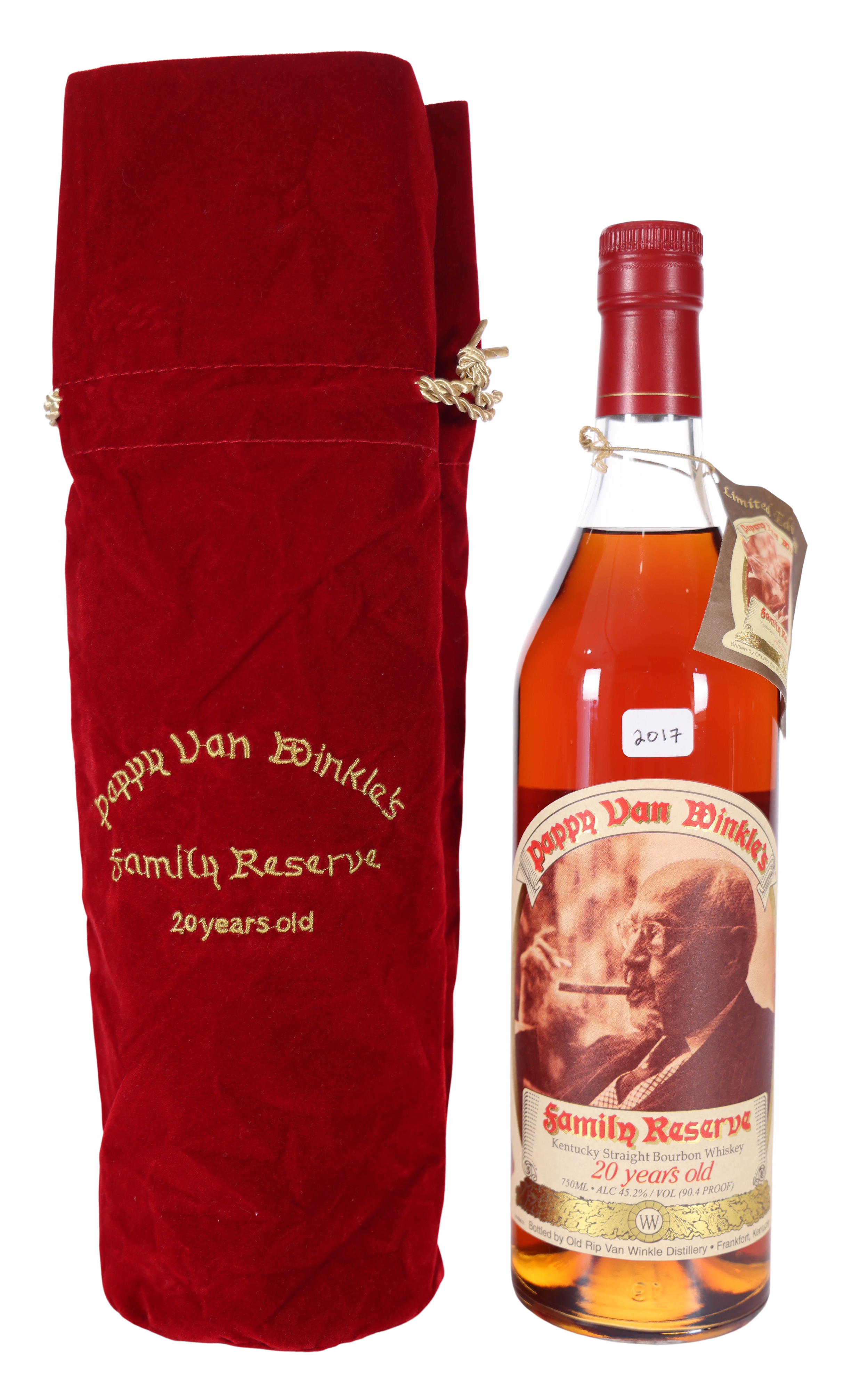 Introducing the Pappy Van Winkle Family Reserve 20 Year, a remarkable release from 2017 that embodies the rich legacy of American bourbon. Crafted at the historic Buffalo Trace Distillery, this bottle is a celebration of tradition and family heritage. Pappy Van Winkle, a name synonymous with excellence, has captivated collectors and enthusiasts alike for generations. This limited edition release comes beautifully presented in a striking red velvet bag, reflecting its esteemed status in the world of spirits. The 20-year aging process in select barrels contributes to its exceptional character, making it a prized addition to any collection. With a rich history dating back to the early 20th century, this bourbon is not just a drink; it is a piece of American heritage that continues to inspire and excite bourbon lovers around the globe. Secure your chance to own this iconic bottle, a true treasure for any connoisseur.