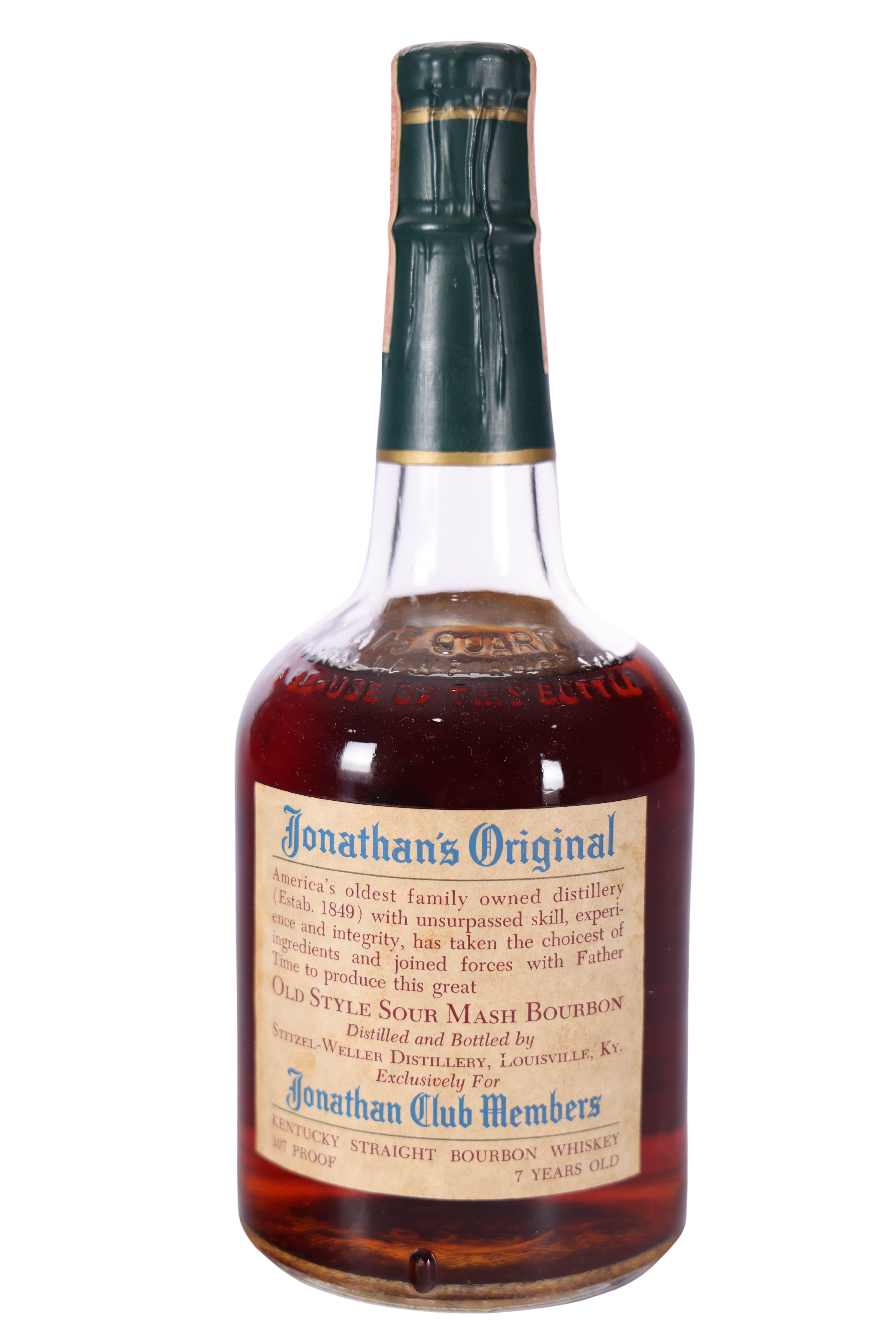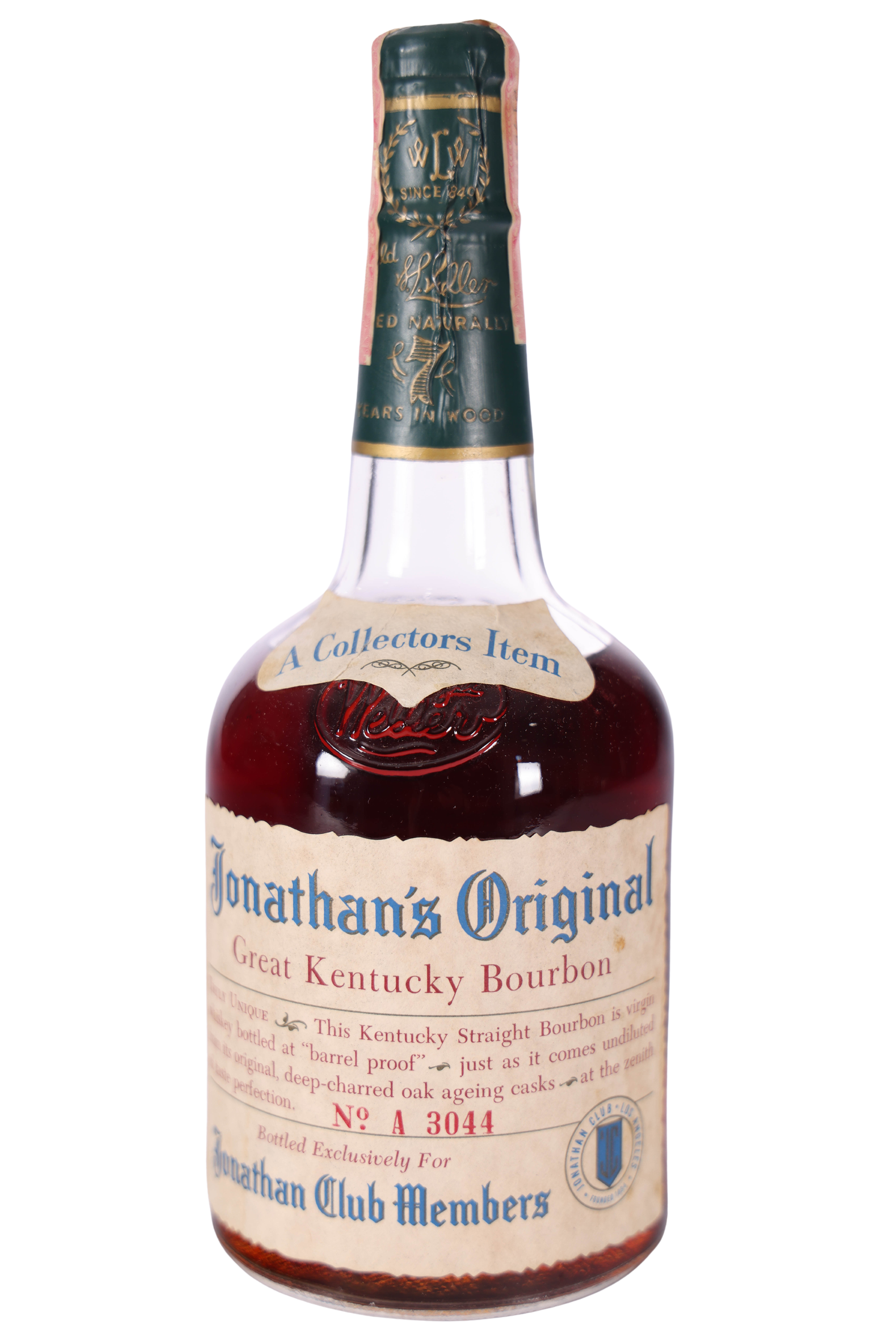 During the 1960s and 1970s, Stitzel-Weller bottled its flagship wheated bourbon under a private label, Jonathan’s Original, for the storied Jonathan Club, a private social organization in Southern California. Slightly younger than Stitzel-Weller brands like Old Fitzgerald and Weller, Jonathan’s Original stands out for its high barrel proof and its vanishing rarity.