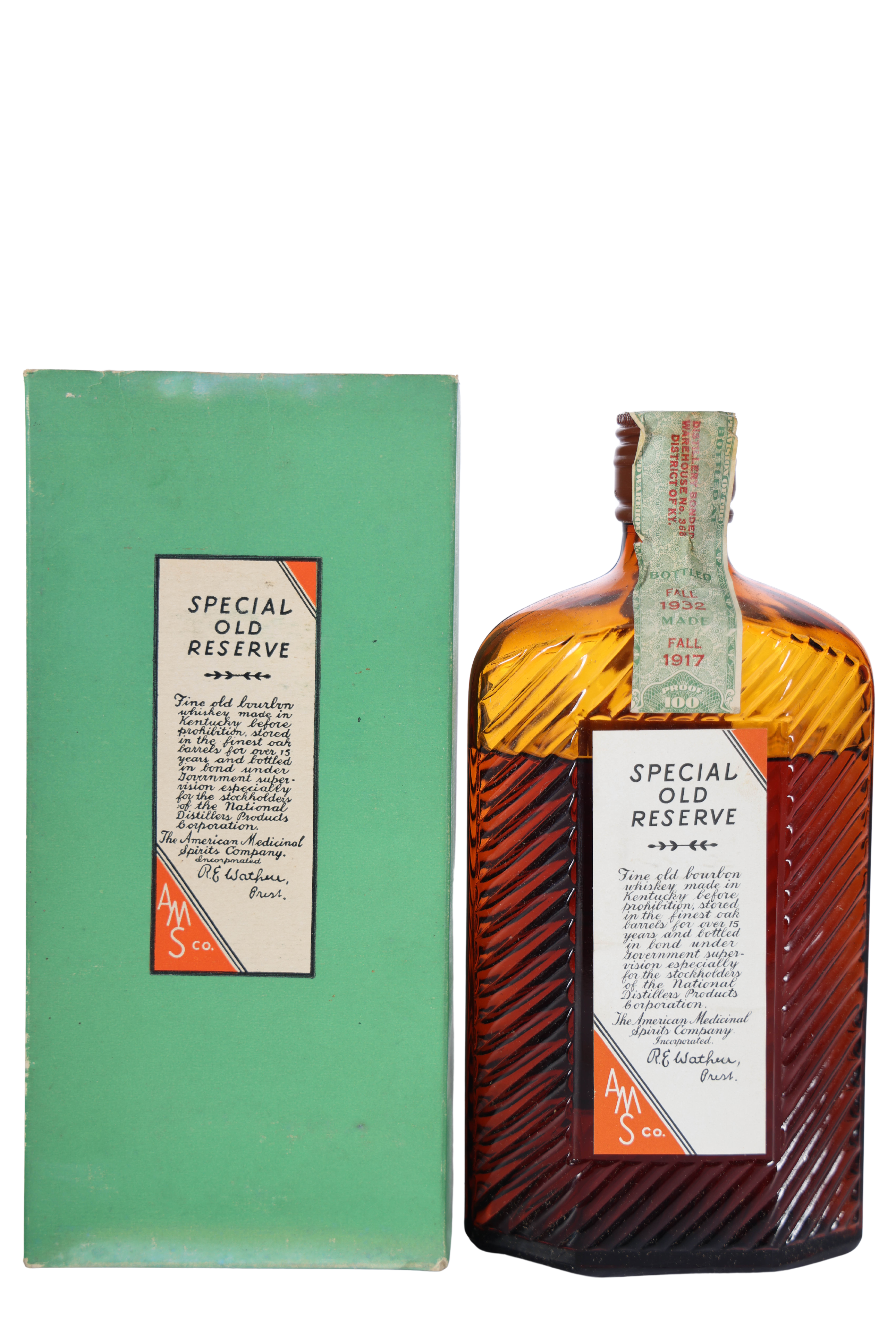 Special Old Reserve 1917 bourbon is a rare, 15-year-old Prohibition-era whiskey distilled in Kentucky in 1917 by the Harry E. Wilken Distillery (Distillery No. 368) and bottled in 1932 by the American Medicinal Spirits Company (AMS Co). Sold for medicinal purposes, these 100-proof bottles are highly collectible, featuring unique ribbed glass and often fetching thousands at auction
