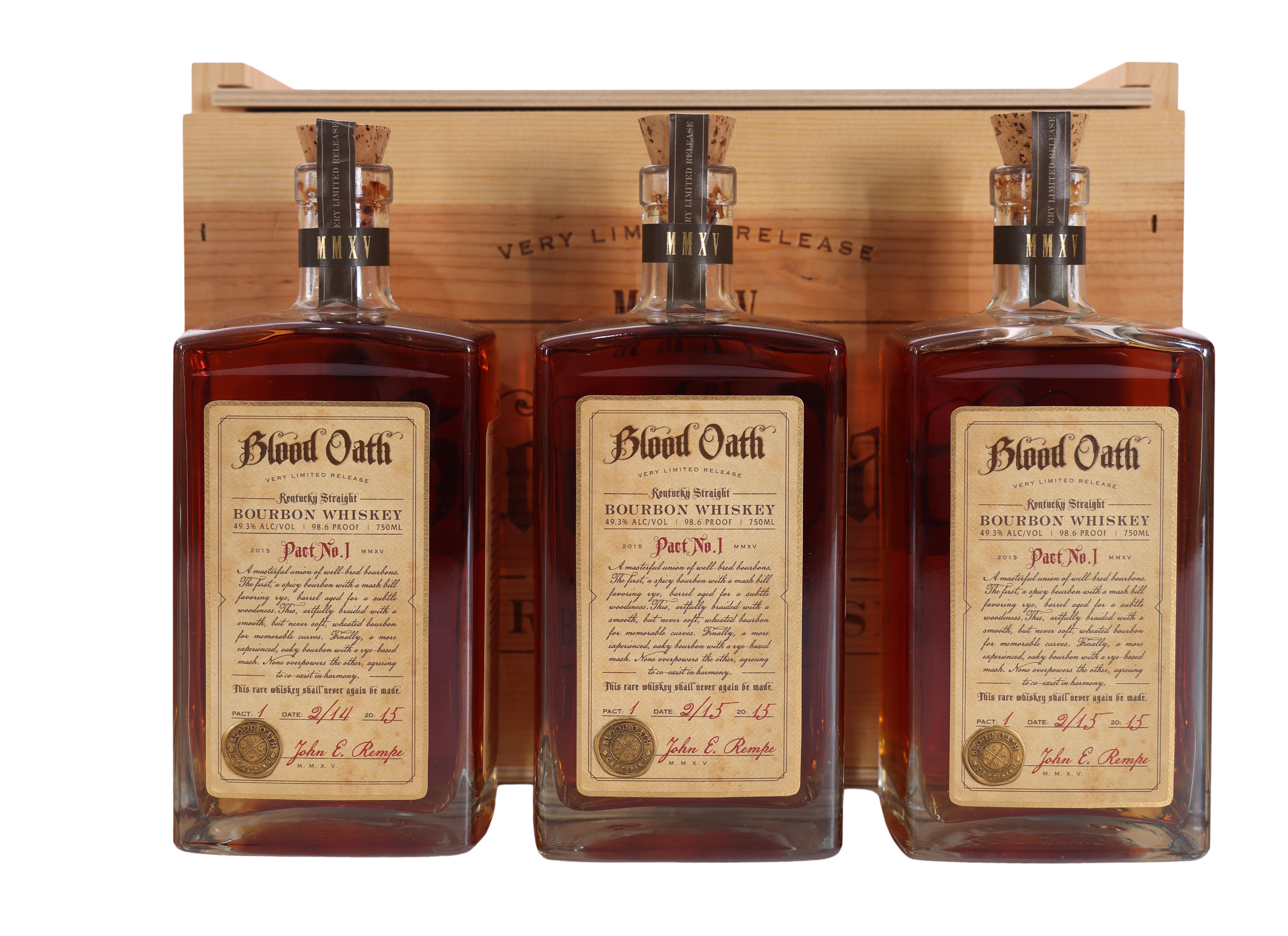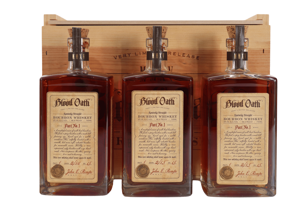 Blood Oath Pact #1, released in 2015, marked the debut of a now-celebrated series that quickly gained a following among bourbon collectors. This inaugural release set the stage for future Pacts, blending rare bourbons from undisclosed sources to create something unique each year. The 3-pack OWC (Original Wooden Case) presentation, shown here, adds to its collectible allure, featuring three bottles in a handsomely branded wooden box. Each bottle is individually numbered and signed by John Rempe, the creator behind Blood Oath. With its distinctive label design and elegant stopper, Pact #1 represents the origin of a sought-after annual series. Bottled at 98.6 proof, this release is both a piece of modern bourbon history and a prized find for enthusiasts who appreciate limited-edition bottlings and the intrigue of undisclosed, expertly blended bourbons.