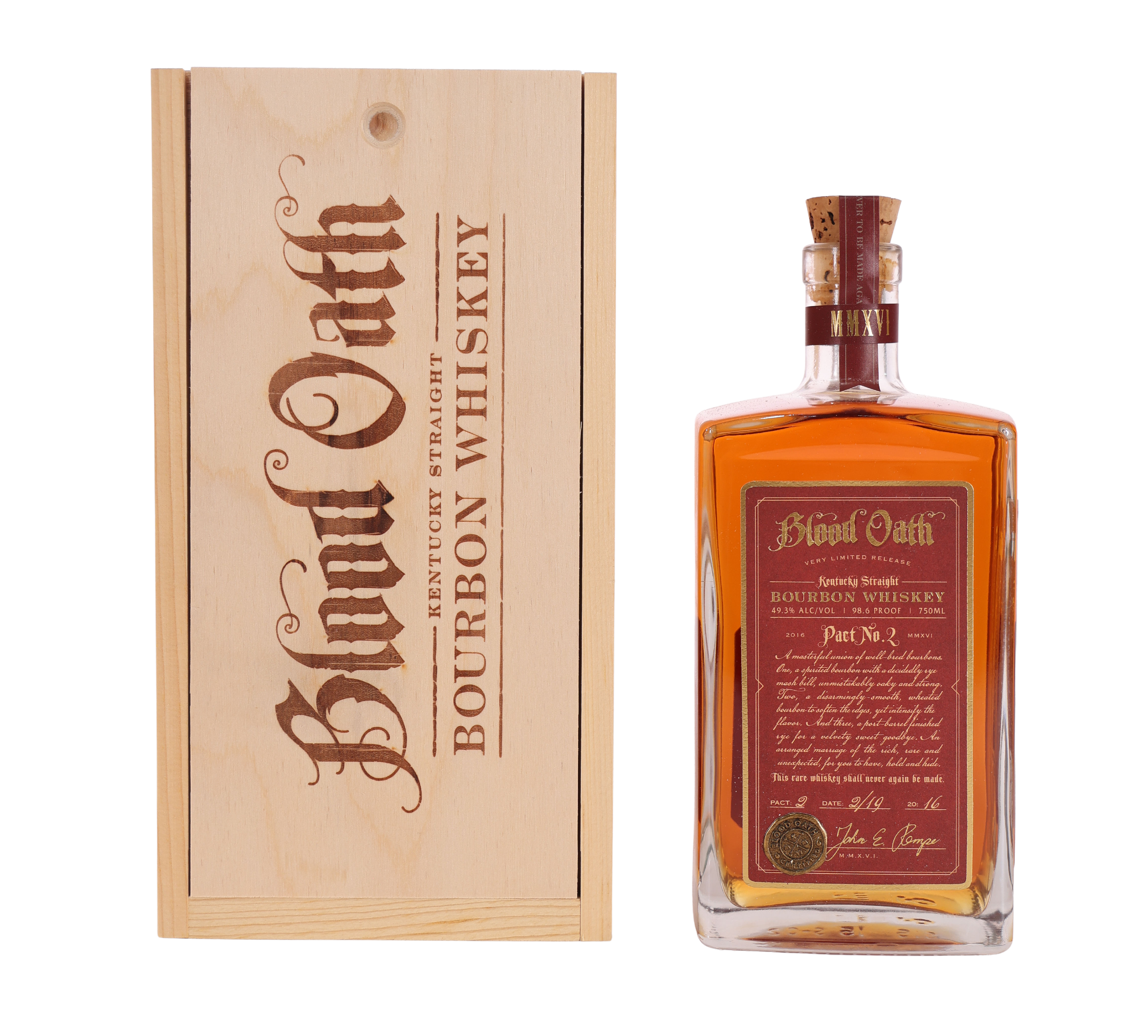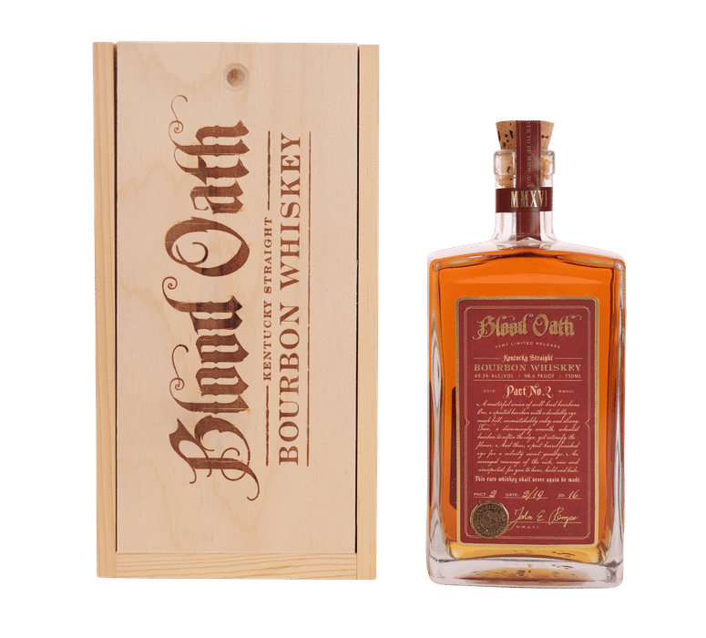Blood Oath Pact No. 2, released in 2016, continues the legacy of this acclaimed series, conceived by Master Blender John E. Rempe. Each annual “pact” is a unique blend, and Pact No. 2 marries three rare Kentucky straight bourbons, including one finished in port barrels. The striking rectangular bottle and branded wooden box highlight its collectible appeal. Blood Oath’s concept revolves around secrecy and rare blending, with each release limited in quantity and never to be replicated. Pact No. 2 is sought after by enthusiasts for its innovative approach and for pushing the boundaries of traditional bourbon. The label’s signature and wax seal add to its sense of exclusivity and intrigue, making it a centerpiece in any rare whiskey collection. This 2016 edition remains a prized find among those who appreciate the story and rarity behind every bottle.