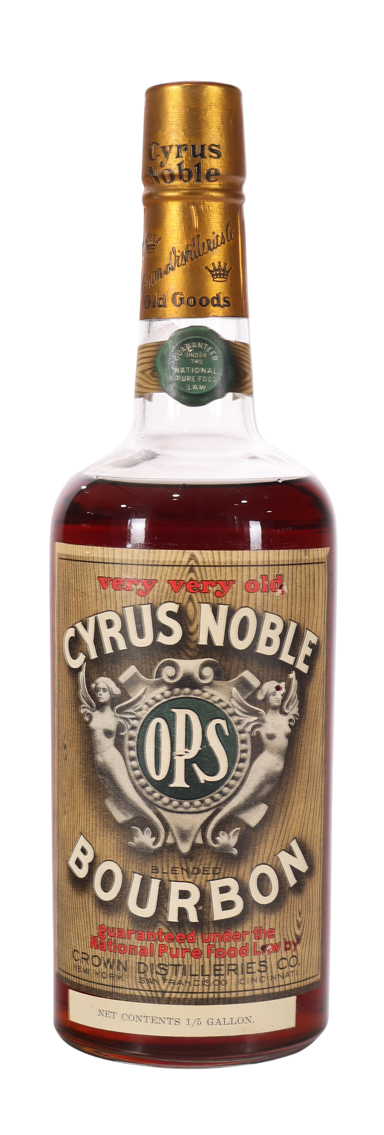 An incredibly old and rare bottle of Very Very Old Cyrus Noble O.P.S Bourbon, early 1900's lead cap.