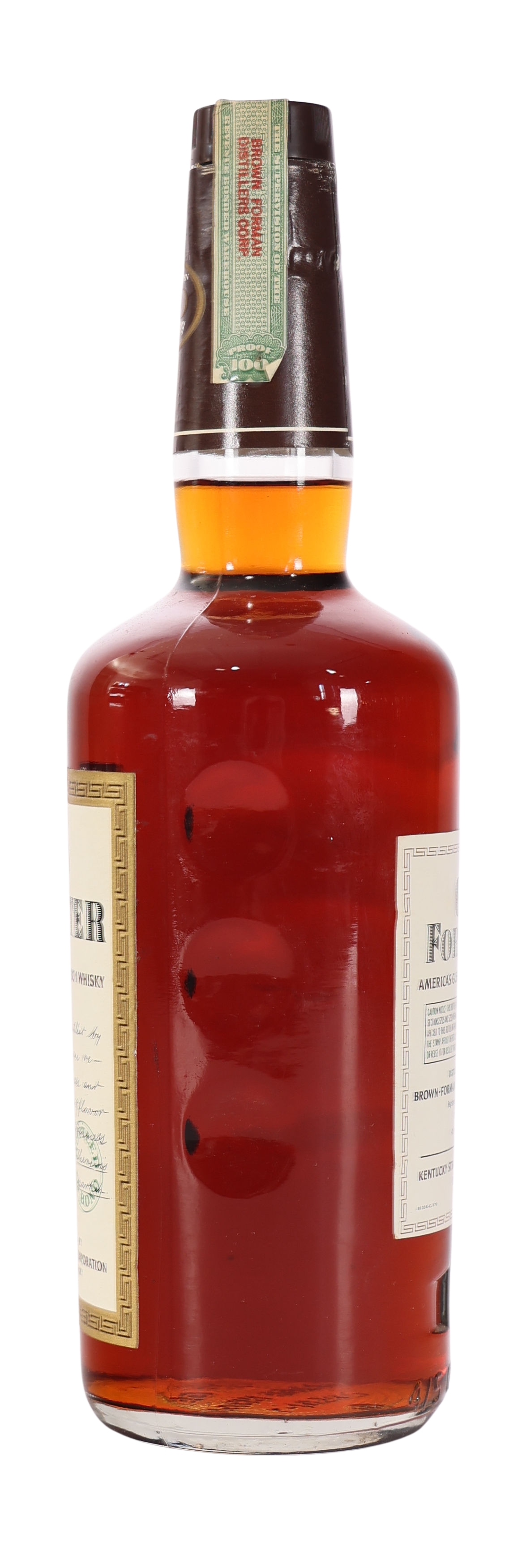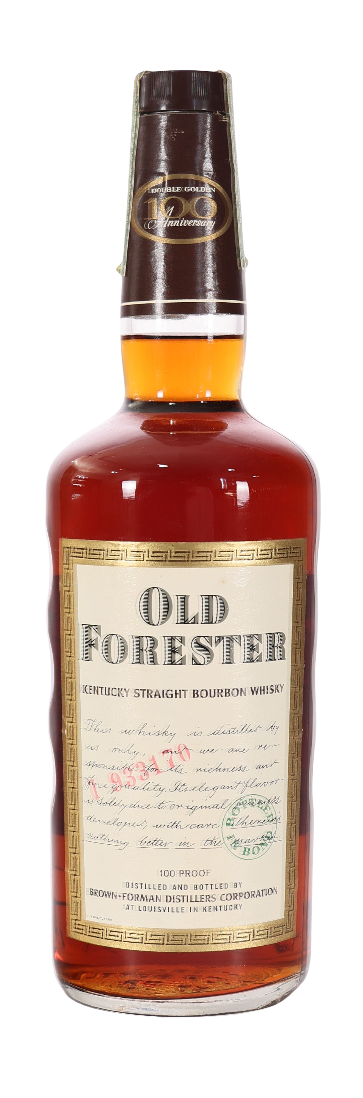 The Old Forester 100th Double Golden Anniversary, Distilled in 1965 and released in 1970, commemorates a significant milestone in the history of bourbon. This limited edition honors the 100-year legacy of Old Forester, the first bourbon sold exclusively in bottles. Established in 1870 by George Garvin Brown, Old Forester has long been a pioneer in the bourbon industry, known for its unwavering commitment to quality. The bottle itself is a reflection of its era, showcasing the brand’s heritage with its elegant design and vintage label elements. This anniversary release encapsulates a century of tradition and innovation, making it a sought-after collectible for whiskey enthusiasts and historians alike. As an emblem of Old Forester’s storied past, it stands as a remarkable piece of bourbon history, appealing to both connoisseurs and collectors.