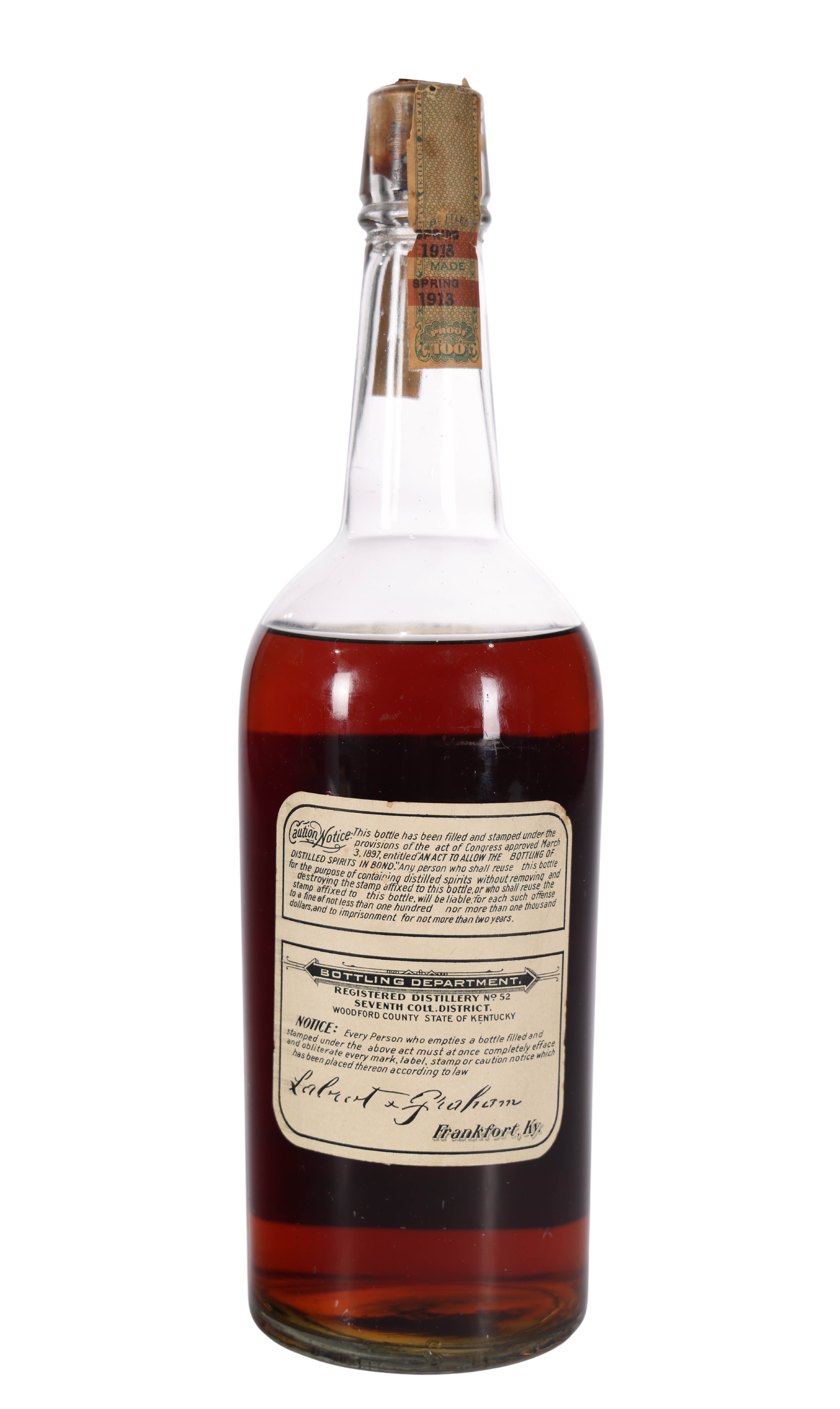 Introducing the Old Oscar Pepper Bottled in Bond Quart, a remarkable piece of whiskey history from the Labrot & Graham distillery. Produced between 1913 and 1918, this bottle captures an era when bourbon was gaining prominence in American culture. The Bottled in Bond Act of 1897 ensured quality and authenticity, making this 100-proof expression a notable example of pre-Prohibition distilling practices. Hailing from Frankfort, Kentucky, the Old Oscar Pepper brand pays homage to the legendary figure in the bourbon world, Oscar Pepper himself. This 5-year-old whiskey reflects the dedication and tradition of its time, appealing to collectors and enthusiasts who appreciate the rich narrative behind each bottle. The intricate label design, a nod to the craftsmanship of the early 20th century, adds to its allure. Securing this rare quart is not just acquiring a bottle; it is preserving a slice of whiskey heritage.