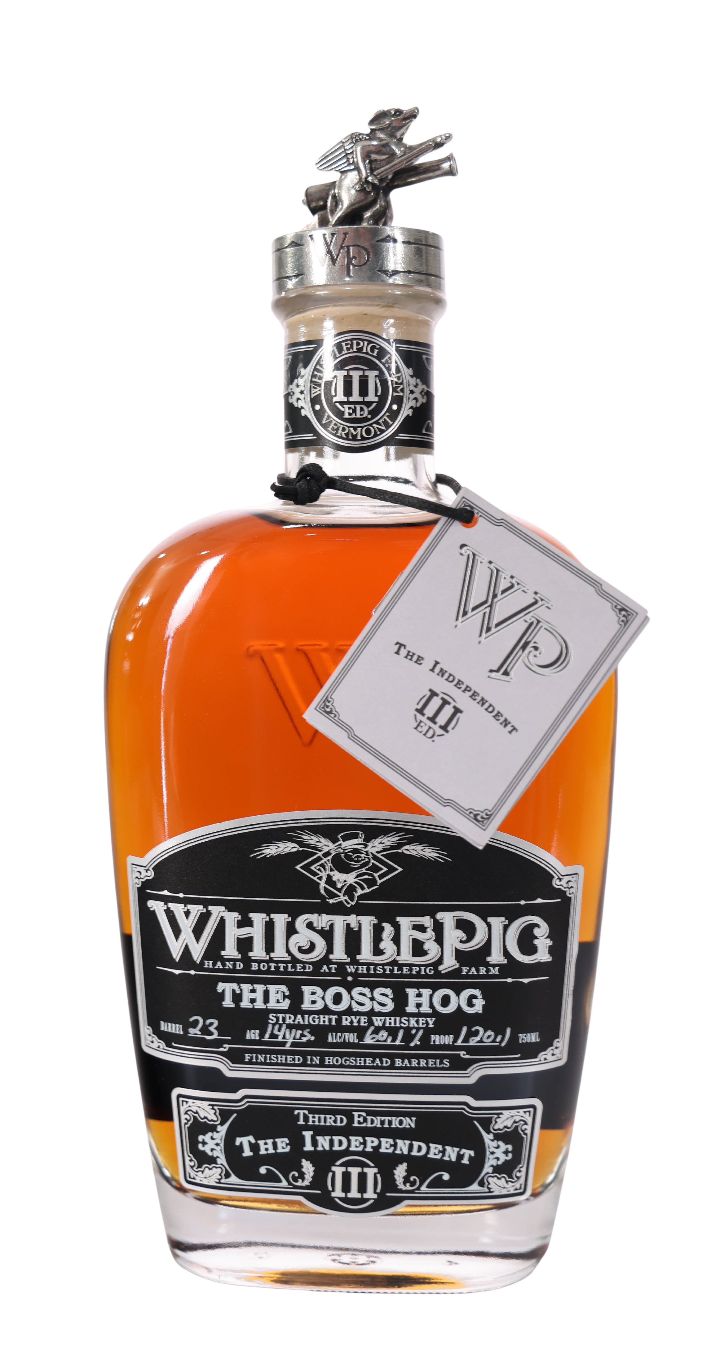 Whistlepig The Boss Hog #3 'The Independent' is a remarkable expression in the lineage of premium rye whiskeys. Released as the third iteration of this celebrated series, Barrel #23 showcases the distillery's commitment to innovation and tradition. Aged for 14 years, this whiskey embodies the essence of time-honored distillation methods while pushing the boundaries of flavor. Each bottle is adorned with a striking design, featuring a unique metal pig stopper, symbolizing the brand's playful yet serious approach to whiskey-making. The Boss Hog series is renowned for its limited releases, making each bottle a coveted collectible. This particular release not only reflects the distillery's heritage but also appeals to enthusiasts seeking something truly special in their whiskey collection.